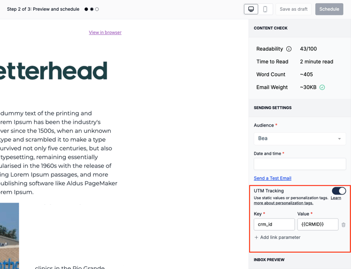 Once published, your UTM parameters will automatically be appended to every link in your newsletter as query strings (e.g., ?utm_source=newsletter&utm_campaign={{CRMID}}).