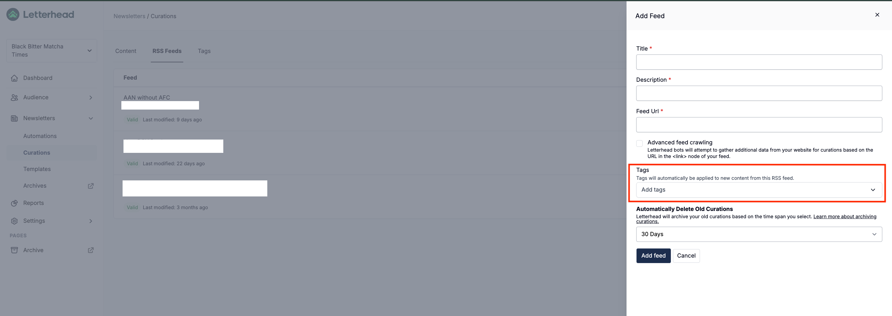 Tag selection in feed settings: Choose from existing tags or create new ones when configuring a feed.