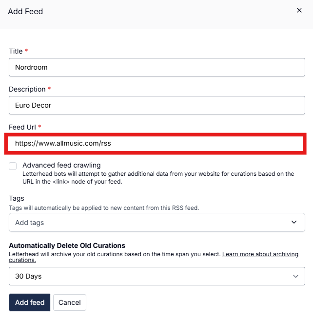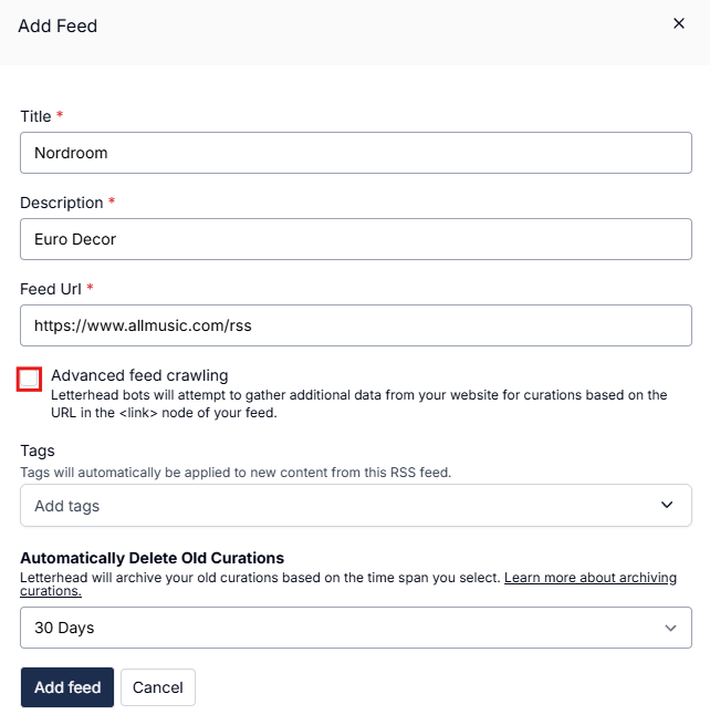 - Determine whether or not to enable the Crawl feed option. If you plan on adding a feed to use with the RSS block, it is best NOT to enable the 'Crawl feed' option. Letterhead will pull content from the feed every 15 minutes per feed.