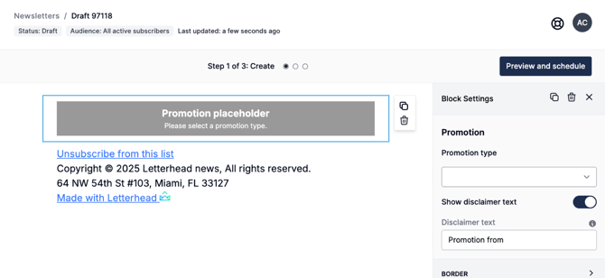 🪄 When your newsletter is scheduled to send on a date that matches an active promotion, the ad will automatically display in the selected position — no need to drag in a promotion block.