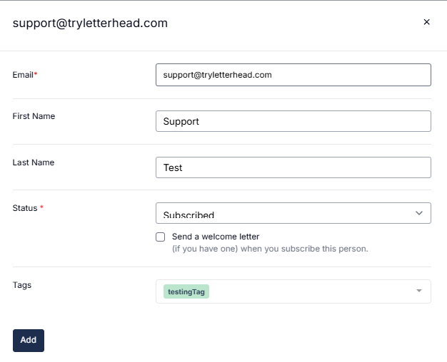 - In the modal , enter the subscriber’s details (email address, name , status , tags ).