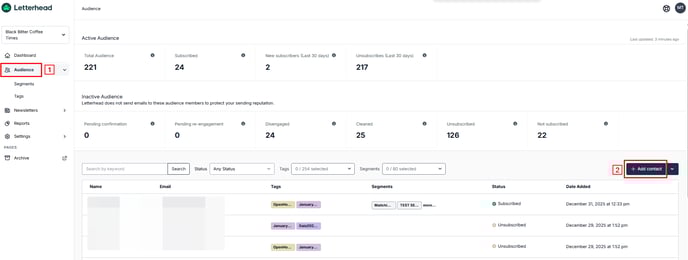 To manually add a single subscriber, you can use the Add Contact button on the Audience page.